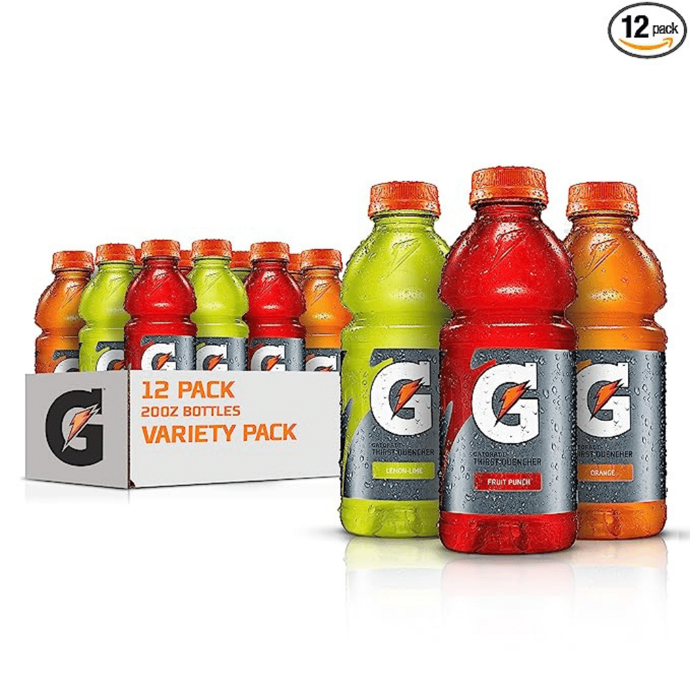 This variety pack includes 12 20-ounce bottles of Gatorade in three delicious flavors - Fruit Punch, Lemon Lime, and Orange. Plus, it contains critical electrolytes to help replace whatโs lost in sweat.